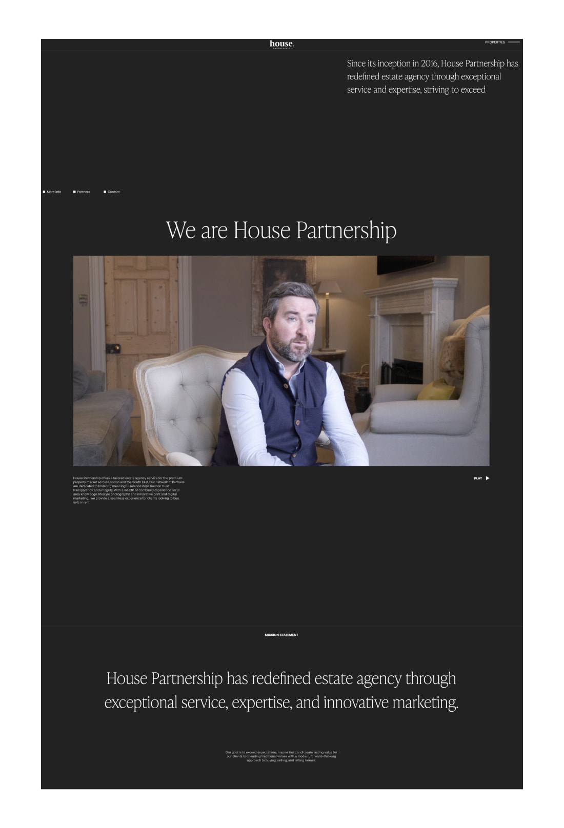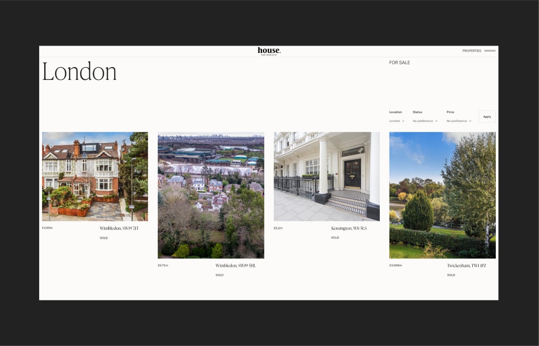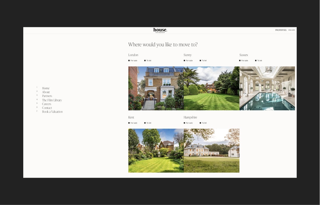 A personal service for some of the most selective properties in London and the South East. The new brand and website had to not only sell houses, but the lifestyle they enable. An understated and elegant website instantly matches the quality of both the service and residences. Sumptuous photography and stylish videos immerse buyers into the places that could be theirs.